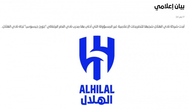 利雅得新月随即在俱乐部官网发布公告进行了回应,“利雅得新月俱乐部对利雅得胜利的葡萄牙籍主帅若热·热苏斯针对我们的不负责任的言论表示强烈谴责,这些言论包含了一些不可接受的诽谤性内容。”